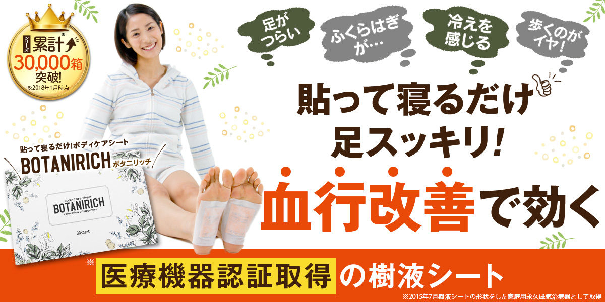 もしあなたがそんな足のお悩みをお持ちの場合は、迷わずボタニリッチをお薦め致します!なにしろ貼って寝るだけで簡単ですし、費用の負担も少ないのでw