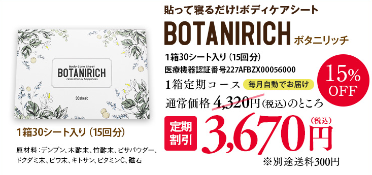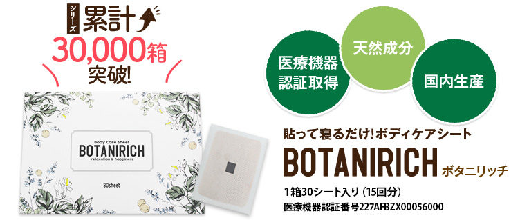 「医療機器認証」というのは、厚生労働省が委託した第三者機関により、製造販売される医療機器が、品質や有効性等の観点から、医療機器として問題がない製品であるか審査し与えられるもので、足裏シートで日本で初めて取得したのがこの「ボタニリッチ」なんだよ!