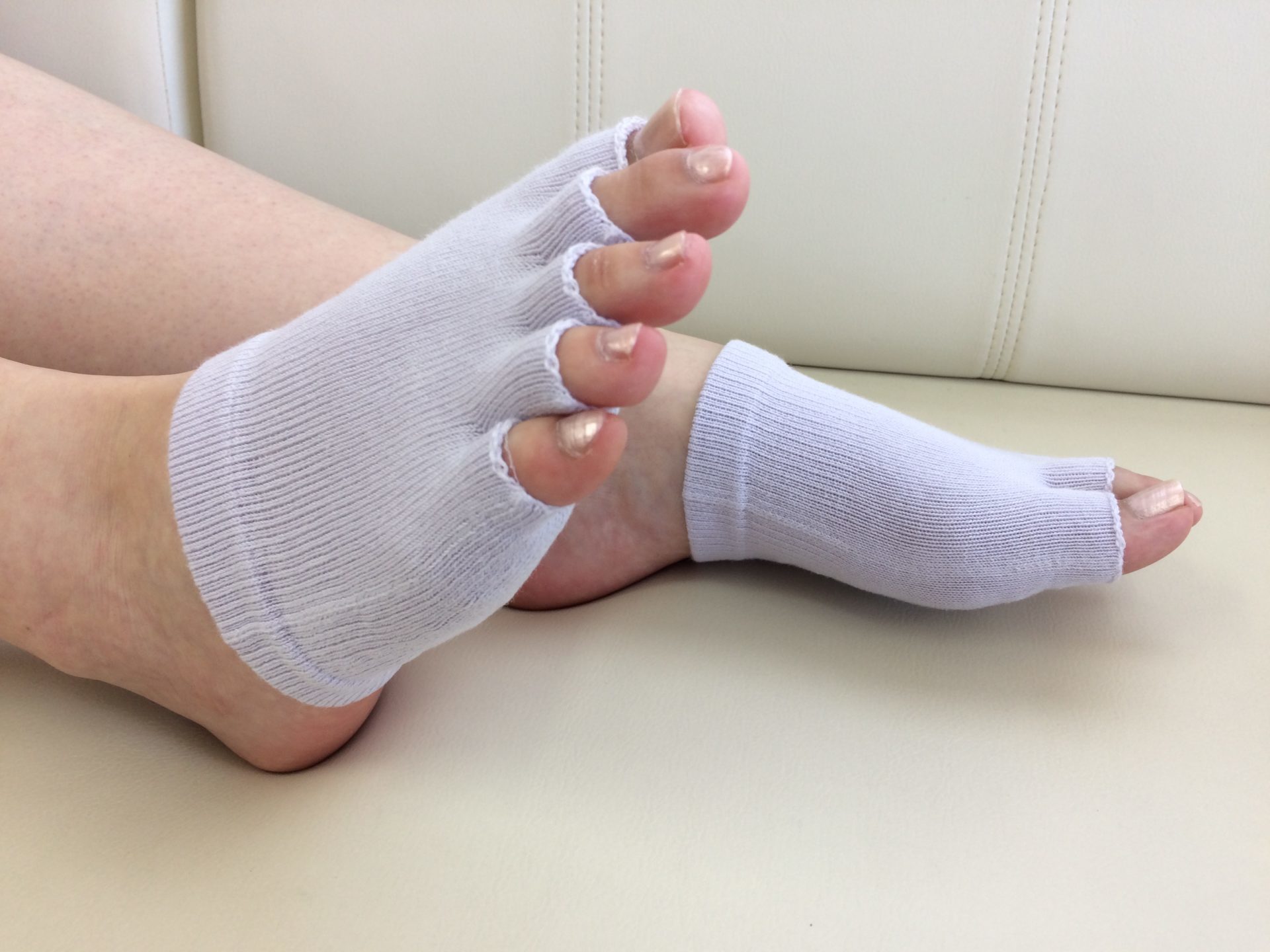私も早速履いてみました。「ゆるりふれ」を履いて家の中を歩いていると、もみもみドットがほどよく足裏を刺激してくれて、いつの間にか足がぽかぽかしてきます。ソックスの厚さは普通の靴下ほどあるのですが、踵と指が出ているので履いている感じがあまりしないですね。5本指にもなっているので、足の指の間の汗も吸ってくれるから汗で冷えてしまう心配もありません。履き心地◎です。